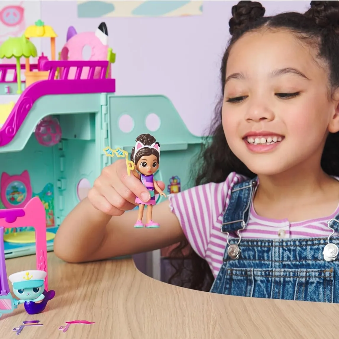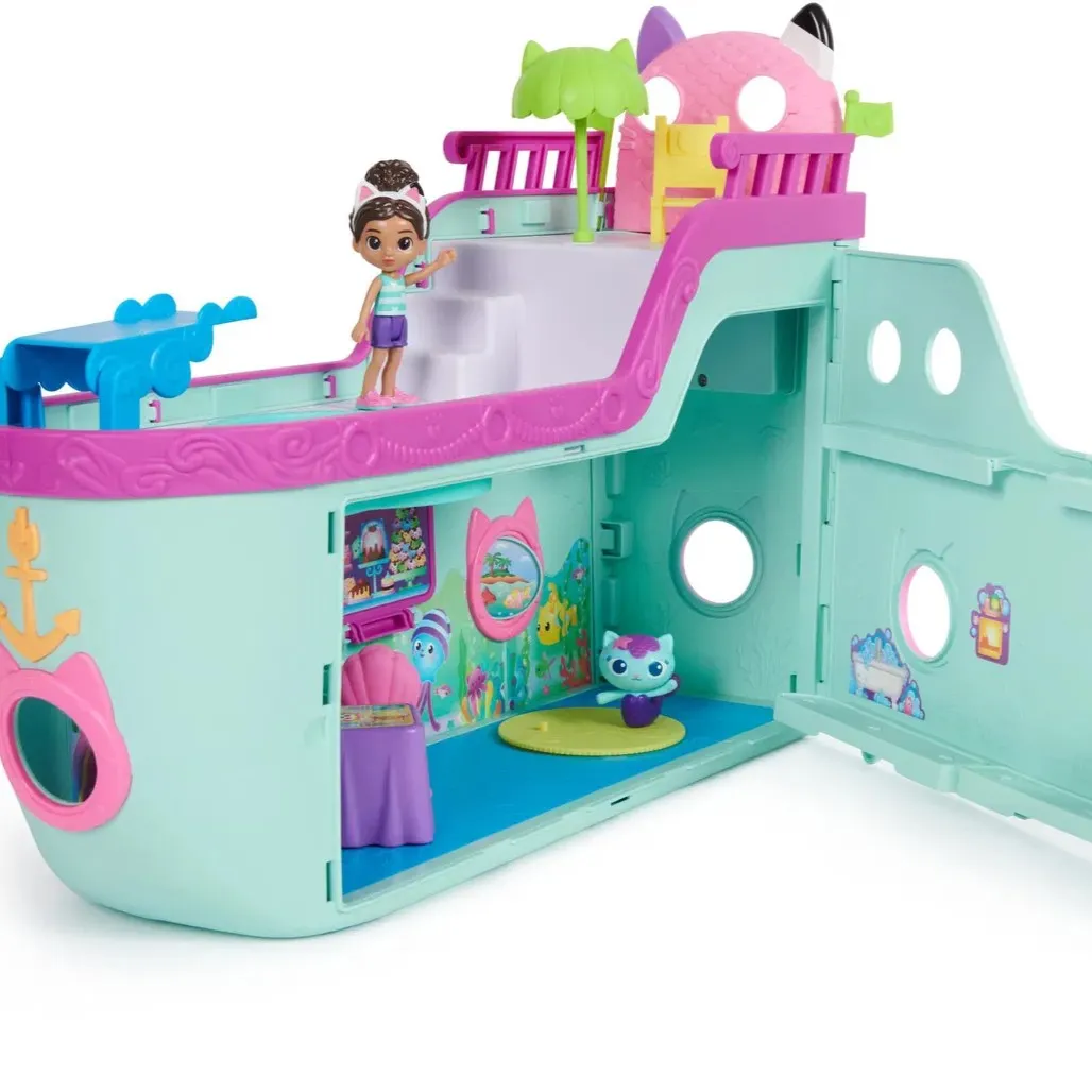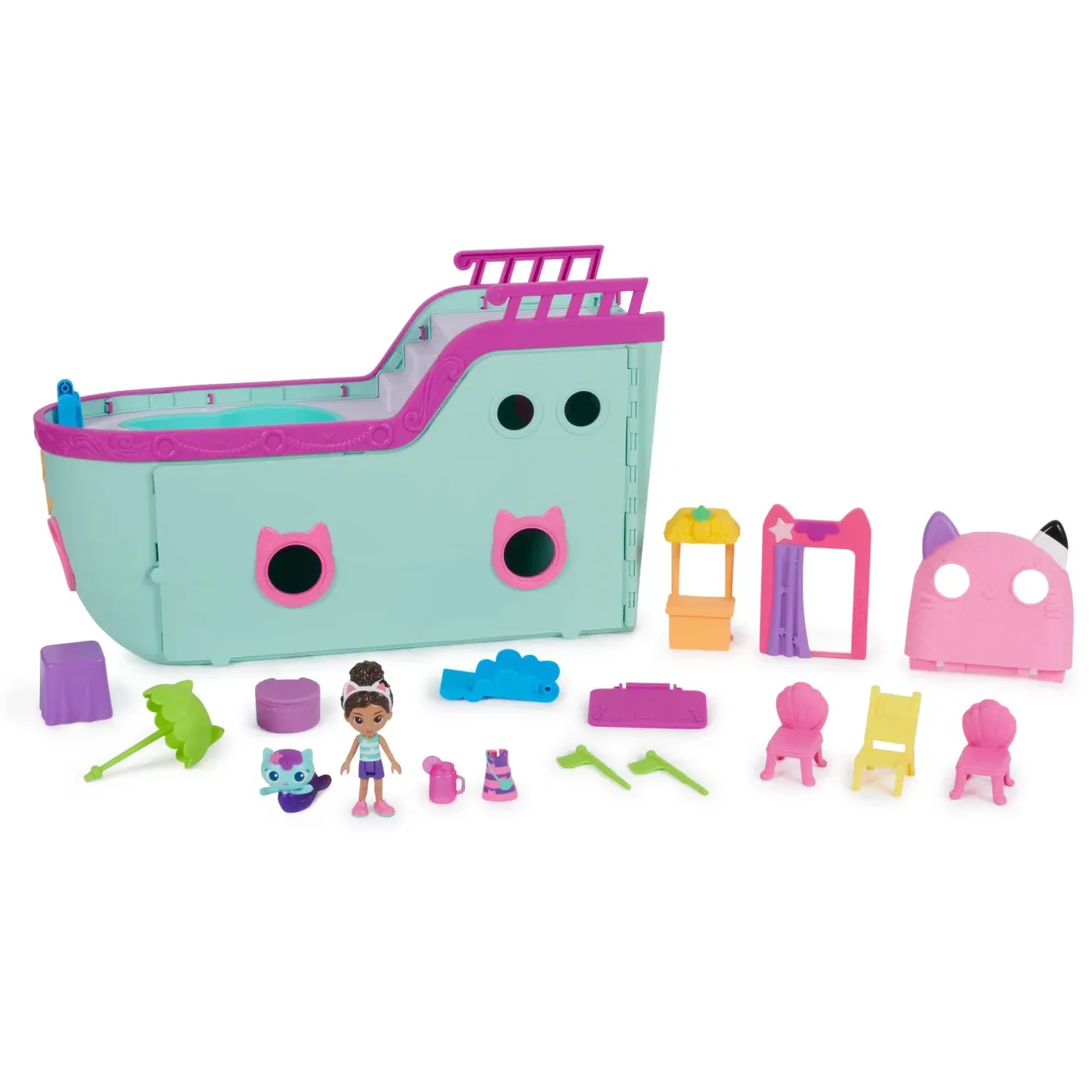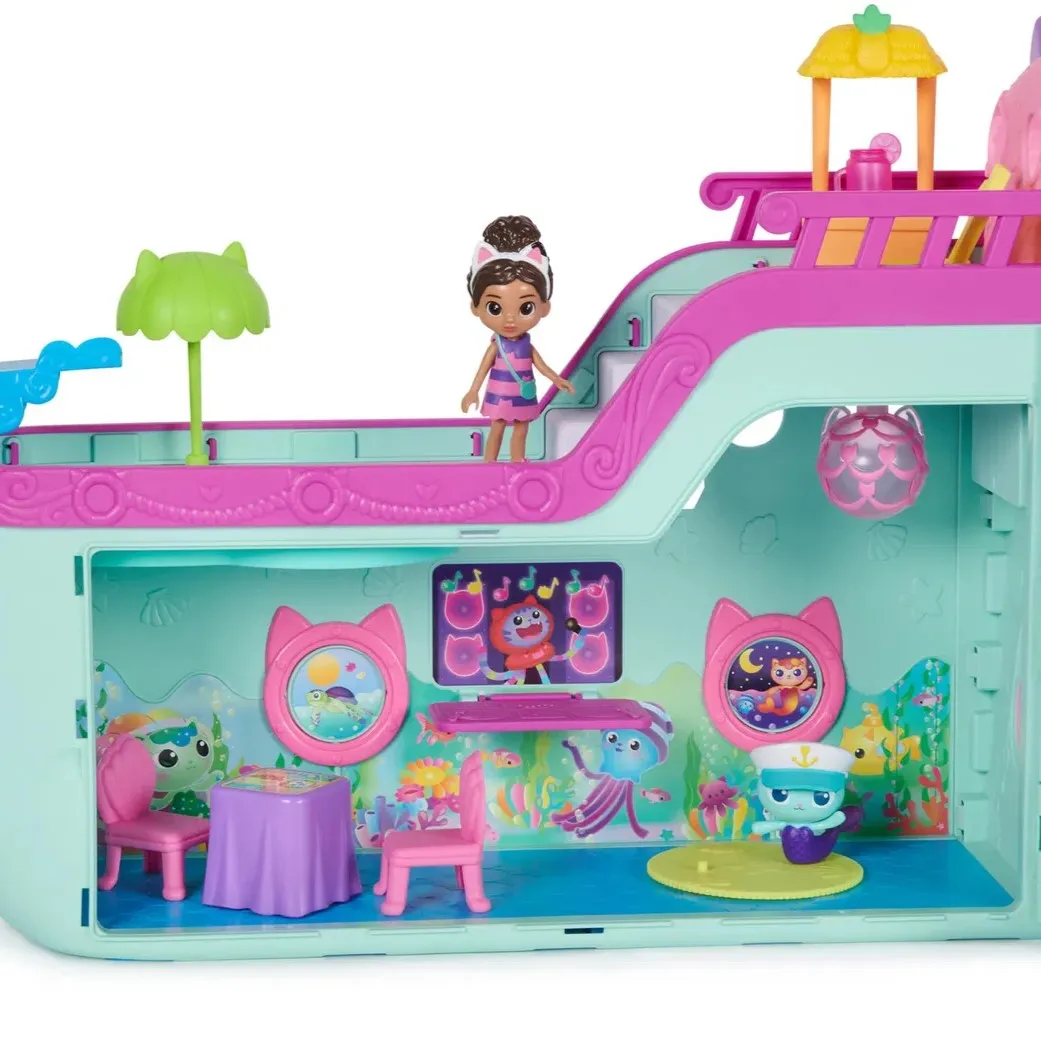 Set Gabbyina čarobna hiška - velika ladja prinaša čarobnost risanke v otroško sobo z več kot 18 pisanimi deli, vključno z Gabby in MerCat figuricama. Otroci lahko dvignejo jadra, skočijo v bazen, obiščejo smoothie bar in raziskujejo vse kotičke ladje. Domislica tu resnično pluje!