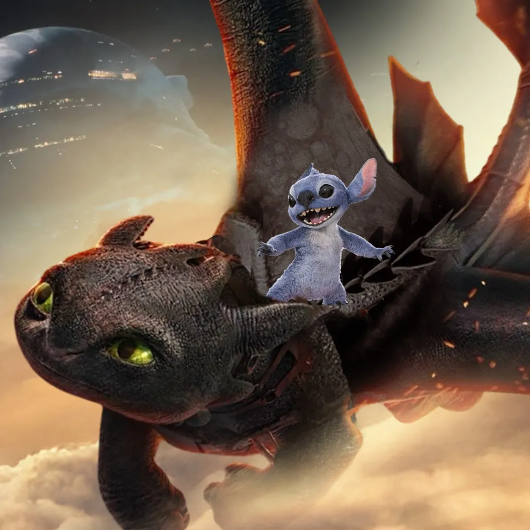 Visoko nad žarečimi oblaki se Brezzobi ozre na Stitcha, ki se drži njegovih lusk. Brezzobi: »Pripravljen, modri nagajivec?« Stitch (se reži): »Vedno! Hitreje, zmaj, hitreje!« Brezzobi zavije z očmi in se strmo požene navzdol. Stitch: »Ujemiva tiste pobegle vesoljske kepice, preden pojedo poglavarjevo čelado!« Z vzklikom se poženejo za lebdečimi kroglami, pustolovščina kliče.