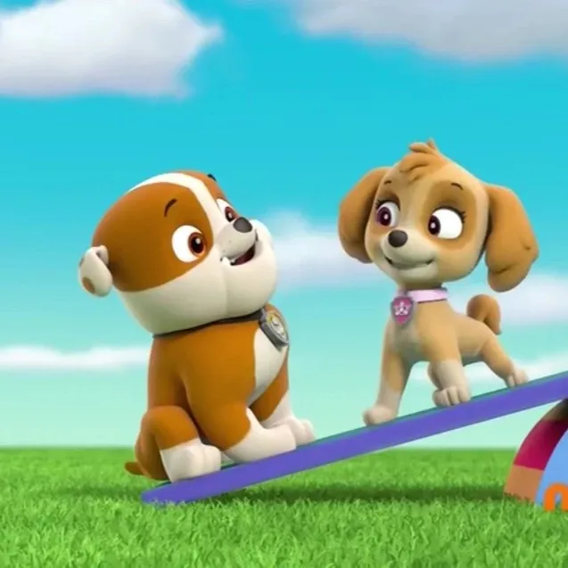 Na zeleni jasi Rubble pravi: »Stavim, da bom dlje na gugalnici kot ti, Skye!« Skye pomežikne: »Pazi zdaj, Rubble - lahka sem kot pero!« Gugalnica se prevesi, Rubble vzklikne: »Ojoj, padam!« Skye se nasmeji: »Poiščeva Yumiinega prašička?« Oba že hitita na nalogo.