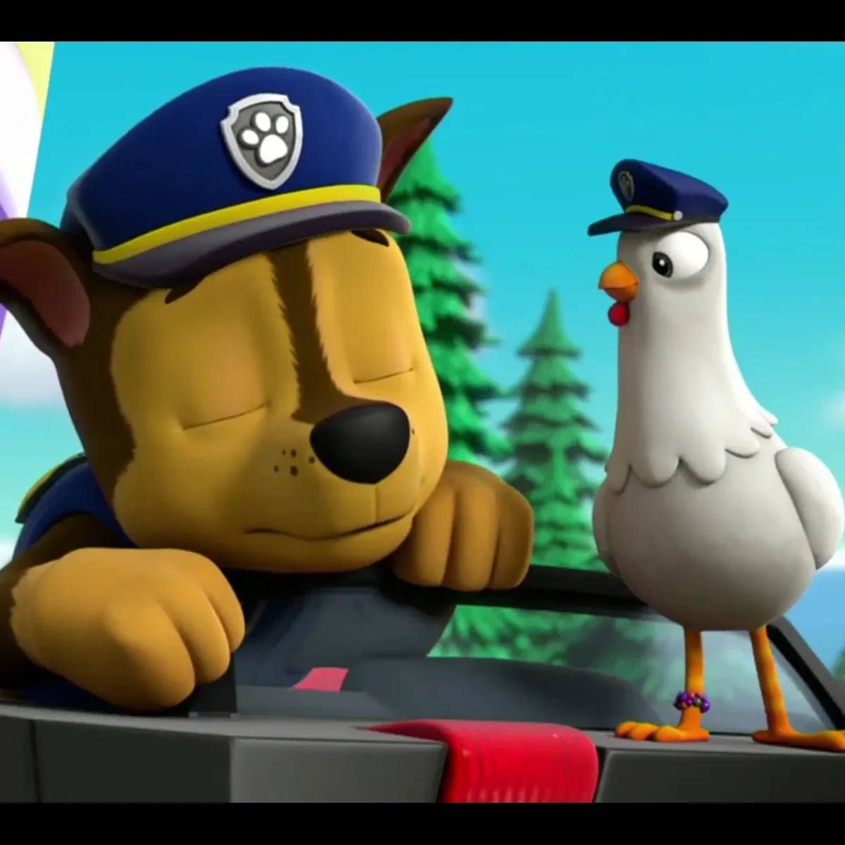 Ob policijskem avtu v Adventure Bayu Chase zavzdihne: »Še ena naloga rešena. Kaj praviš, Chickaletta?« Chickaletta zakokodaka in kljune v značko. »Ko-ko! Vedno pripravljena, policist!« Chase se zasmeje: »Misliš, da boš tokrat hitrejša?« Chickaletta pomežikne: »Ko-ko, izziv sprejet!« Skupaj hitita iskat izgubljeno zlato piščalko, preden to opazi županja Goodway!
