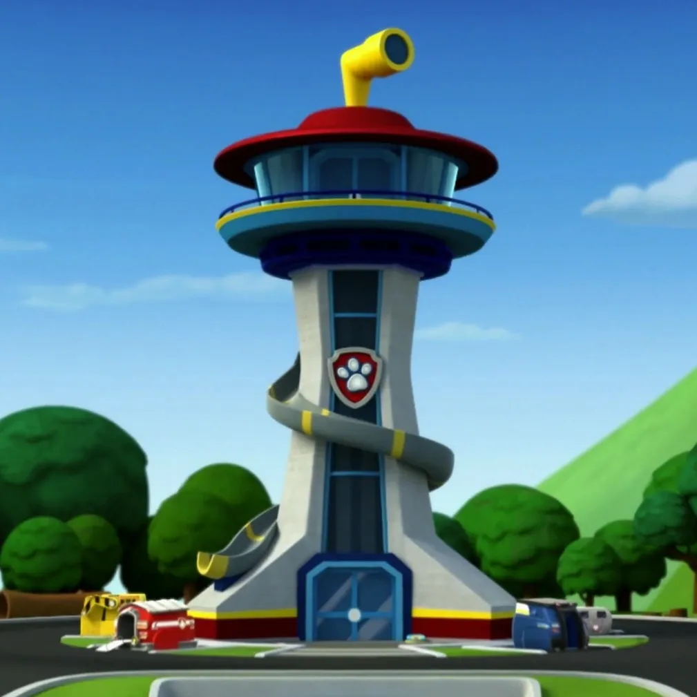 V stolpu Ryder opazuje skozi periskop. “Chase, pripravljen na akcijo?” Chase maha z repom: “Chase je vedno pripravljen!” Skye se zasmeji: “Naj ta rešitev poleti!” Marshall se spotakne ob kocko: “Sem pripravljen… in že na tleh!” Mladički pohitijo—most v Adventure Bayu je zaprt, ekipa mora ukrepati!