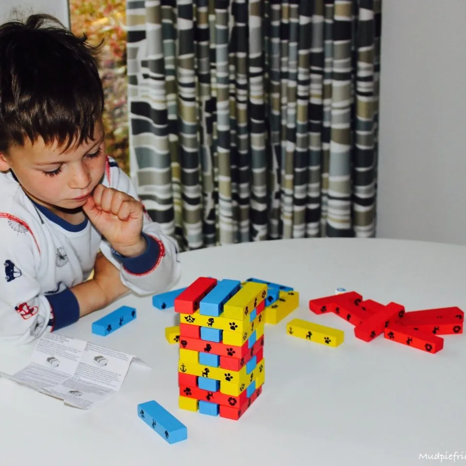 Zberemo se okoli mize, vržemo barvno kocko in previdno vlečemo bloke, medtem ko si navijamo. Napetost narašča, smeh napolni prostor.