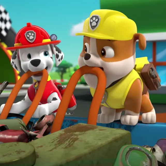 V delavnici Adventure Bay Marshall drži cev. »Si pripravljen, Rubble? Gremo na blato!« Rubble pomežikne: »Rojen sem pripravljen, prijatelj! Pazi zdaj.« Marshall se zasmeji: »Samo repa mi spet ne povozi.« Skupaj napolnita cev. »Rešimo dirkališče pred mega zmešnjavo!« zakliče Rubble. »Tačke na patrulji gremo!«