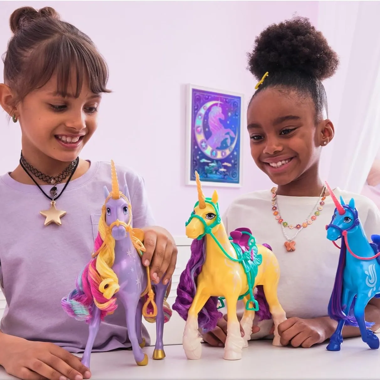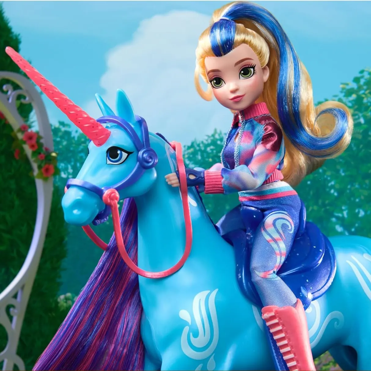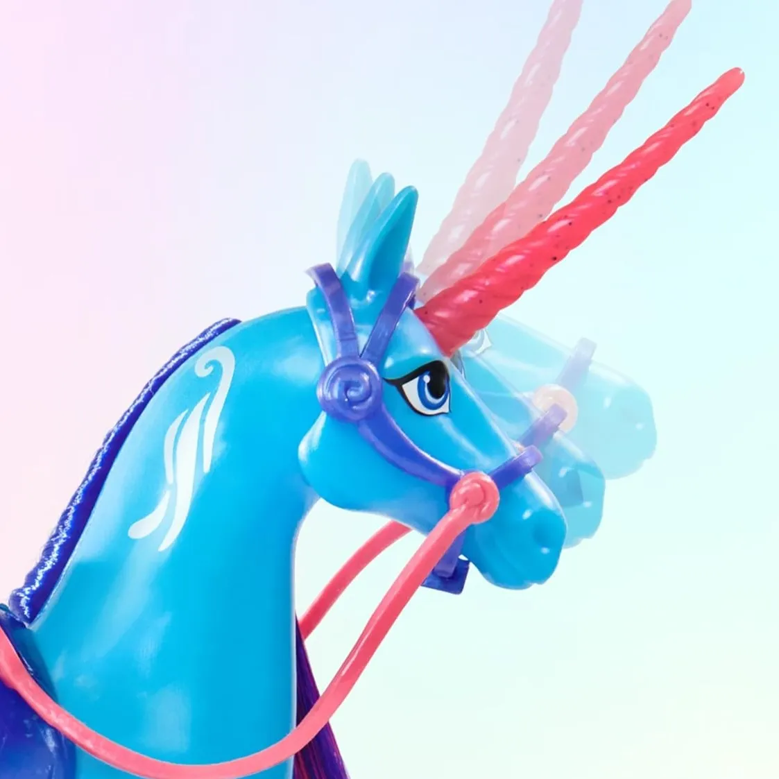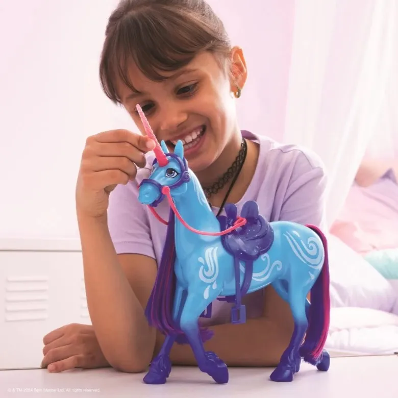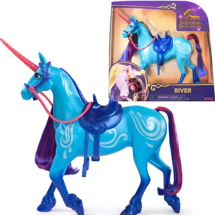 Unicorn Academyjev samorog River ima bleščečo modro-roza grivo, sijoč rog in snemljiv sedlo. Premikajoča glava in krtačljiva griva oživita zgodbe iz Netflix serije, otroci pa lahko izmišljajo lastne dogodivščine. Pristni detajli in vez z Isabel spodbujajo domišljijsko igro.